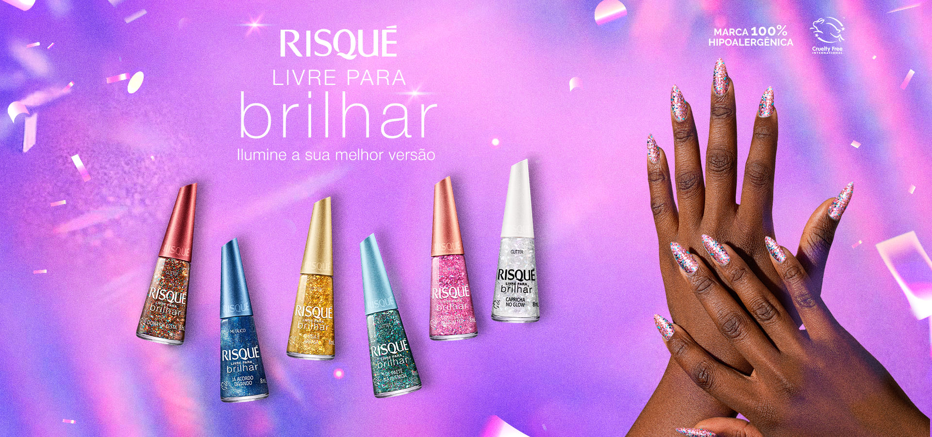 Para maior durabilidade e brilho, utilizar Cobertura Brilhante após a aplicação do glitter.